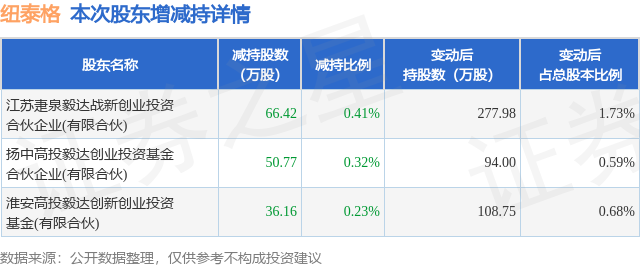 证券之星消息,9月16日纽泰格发布公告《纽泰格:关于特定股东减持股份结果公告》,其股东江苏疌泉毅达战新创业投资合伙企业(有限合伙)、扬中高投毅达创业投资基金合伙企业(有限合伙)、淮安高投毅达创新创业投资基金(有限合伙)于2025年6月24日至2025年8月19日间合计减持153.35万股,占公司目前总股本的0.957%,变动期间该股股价上涨32.25%,截止8月19日收盘报23.25元。